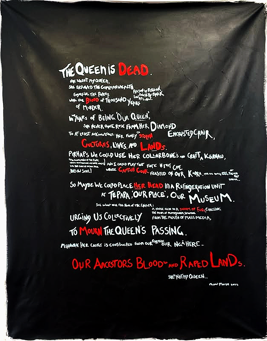 “The Queen is Dead” explores the emotions of anger and grief. This painting offers an alternative story of her passing. During Matariki, we honour the dead, calling forth memories of those who have gone. Long live the Queen